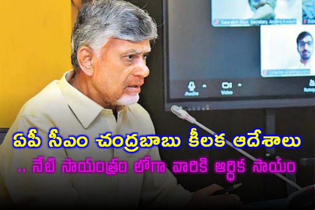 అకాల వర్షాల కారణంగా పంటల నష్టాన్ని వెంటనే అంచనా వేసి, నష్టపోయిన రైతులకు మంగళవారం సాయంత్రంలోగా పెట్టుబడి సాయం అందించాలని ముఖ్యమంత్రి చంద్రబాబు ఆదేశించారు. పిడుగుపాటు కారణంగా చనిపోయిన 10 మంది కుటుంబాలకు తక్షణమే పరిహారం ఇవ్వాలని స్పష్టం చేశారు. రాష్ట్రంలో అకాల వర్షాలు, పంటనష్టంపై సోమవారం సచివాలయం నుంచి జిల్లా కలెక్టర్లతో ఆయన వీడియో కాన్ఫరెన్స్ నిర్వహించారు. పిడుగుపాటుకు చనిపోయిన పశువులకు నిబంధనలకు అనుగుణంగా సాయం విడుదల చేయాలని చెప్పారు. అకాల వర్షాలతో 2,224 హెక్టార్లలో వరి, మొక్కజొన్న దెబ్బతిన్నాయని, 138 హెక్టార్లలో అరటి, బొప్పాయి, మామిడి తదితర ఉద్యాన పంటలకు నష్టం వాటిల్లిందని అధికారులు సీఎంకు నివేదిక ఇచ్చారు. పశ్చిమగోదావరి జిల్లాలో 1,033 హెక్టార్లు, నంద్యాలలో 641, కాకినాడలో 530, శ్రీసత్యసాయి జిల్లాలో 20 హెక్టార్లలో పంటలకు నష్టం వాటిల్లిందని తెలిపారు. కృష్ణా, ఏలూరు, కాకినాడ, ఎన్టీఆర్, తిరుపతి, నంద్యాల, పశ్చిమ గోదావరి జిల్లాల్లో ఉద్యాన పంటలు దెబ్బతిన్నాయని వివరించారు